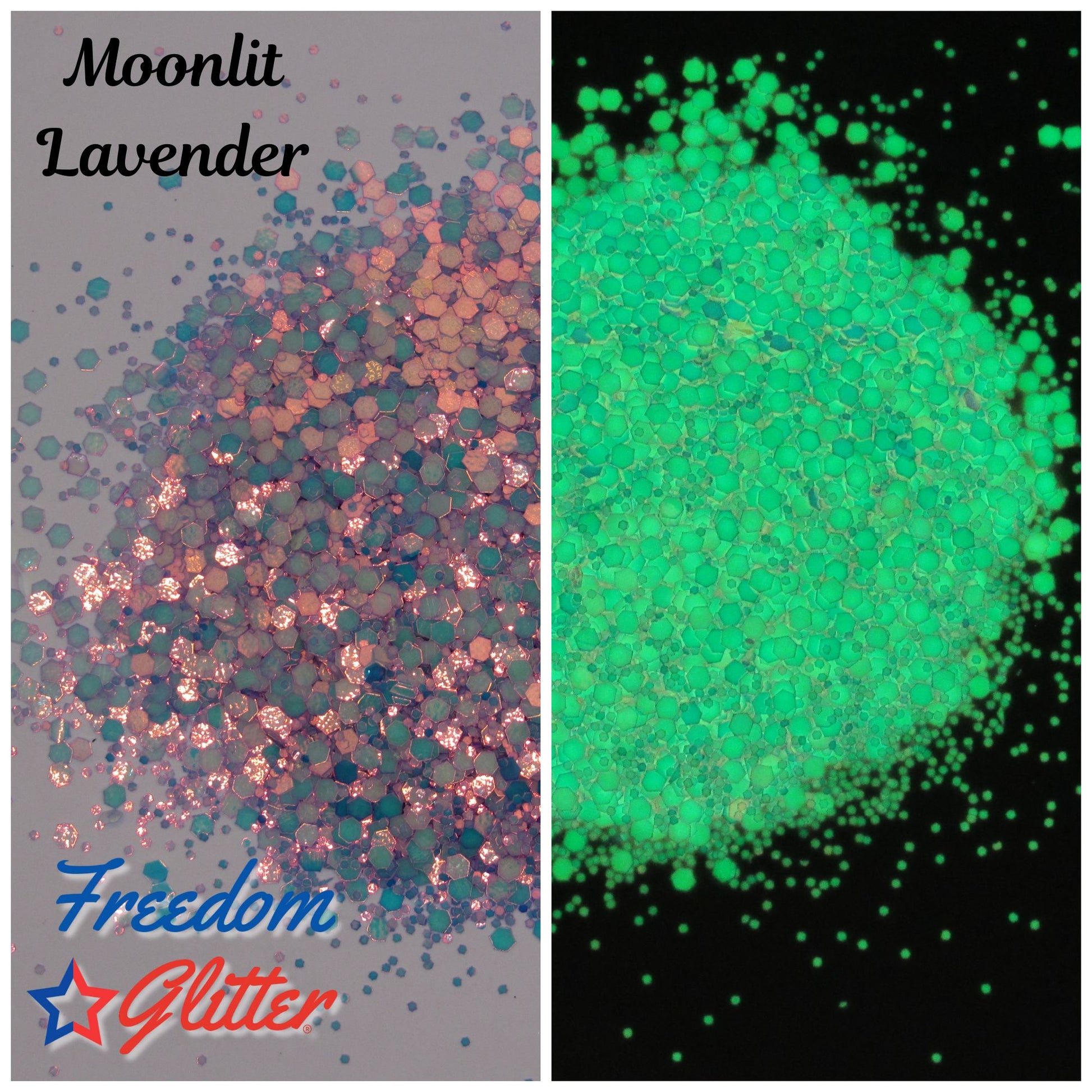 Dive into the glowing depths of creativity with Moonlit Lavender Glow Glitter from Freedom Glitter, LLC! This mesmerizing teal-blue chunky mix captures the calm, mystical shimmer of moonlight reflecting on water — glowing brilliantly in the dark and under UV light.