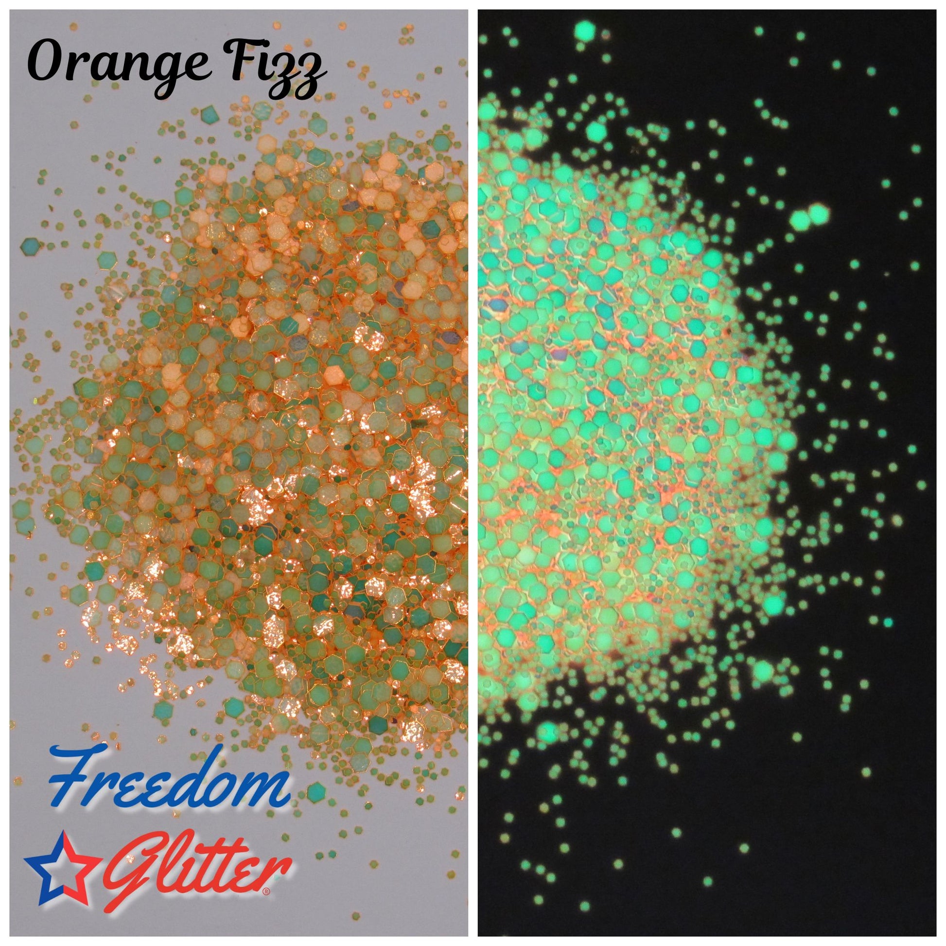 Get ready to light up your creations with Freedom Glitter’s Orange Fizz Glow Glitter — a vibrant chunky mix that glows brilliantly in both orange and green hues!
